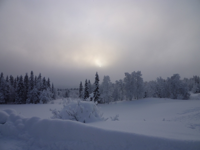 We wind our way along a road lined with birch and fur trees, their branches bravely holding up under the 40cm of snow that has fallen in the past week. Ice and softly falling snowflakes reflect the light from the headlights as Eva drives us north.